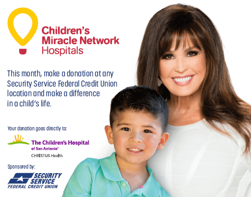 Security Service Federal Credit Union (SSFCU) has partnered with Children’s Miracle Network Hospitals (CMNH) to collect donations in all areas where SSFCU operates, with all funds benefiting local children’s hospitals! Now through March 31, stop by your local SSFCU branch and make a donation to The Children’s Hospital of San Antonio!