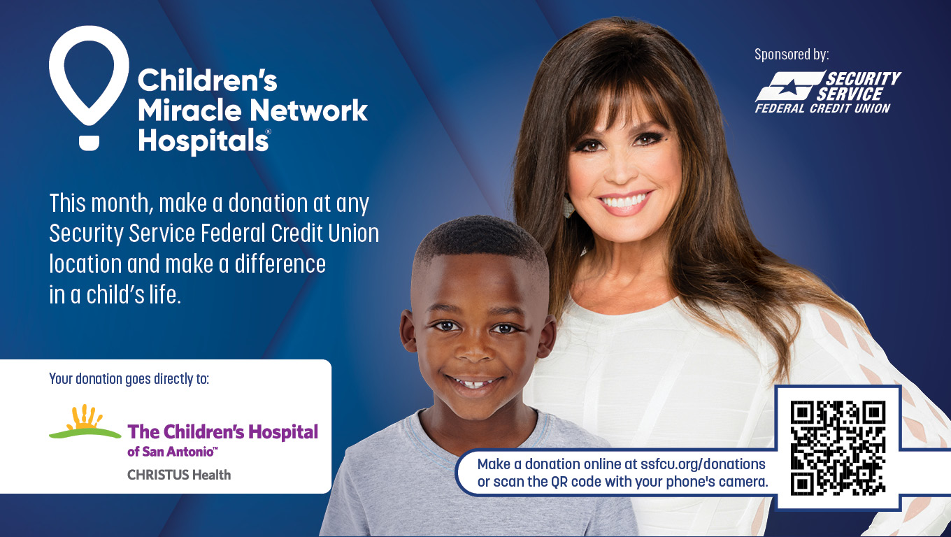 Security Service Federal Credit Union (SSFCU) has partnered with Children’s Miracle Network Hospitals (CMNH) to collect donations in all areas where SSFCU operates, including Texas, Colorado, and Utah, with all funds benefiting local children’s hospitals! Now through March 31, stop by your local San Antonio-area SSFCU branch and make a donation to The Children’s Hospital of San Antonio or donate online. SSFCU will promote the campaign via 15 and 30 second public service announcements featuring Marie Osmond on TV, radio, and digital platforms. They will have multi-media boards in their branches and donation cards will be available!