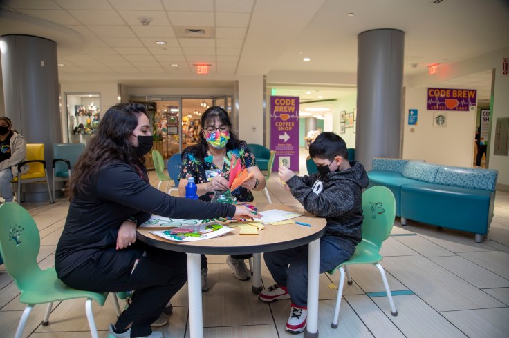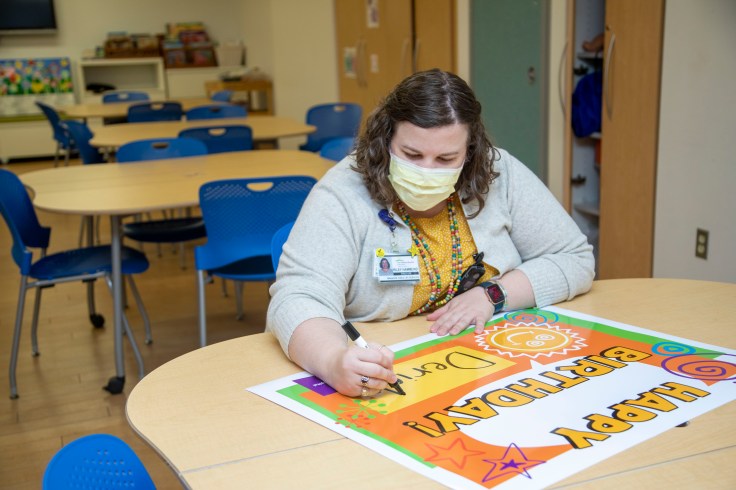 During a patient’s stay, they, as well as their families, are introduced to their child life specialist who will offer them a sense of normalcy through special activities, art projects, holiday celebrations, and much more. Throughout 2020, 2021 and 2022, telepresence robots were used to provide bedside activities, including music therapy, video chats with family members, and so much more. Closed-circuit television programs were set up in lieu of group activities, where patients were able to tune-in via their individual rooms for fun activities. While still maintaining safe social distancing practices, patients are given the chance to step away from their rooms, or their siblings’ rooms, and have some much needed fun in our Child Life Zone.