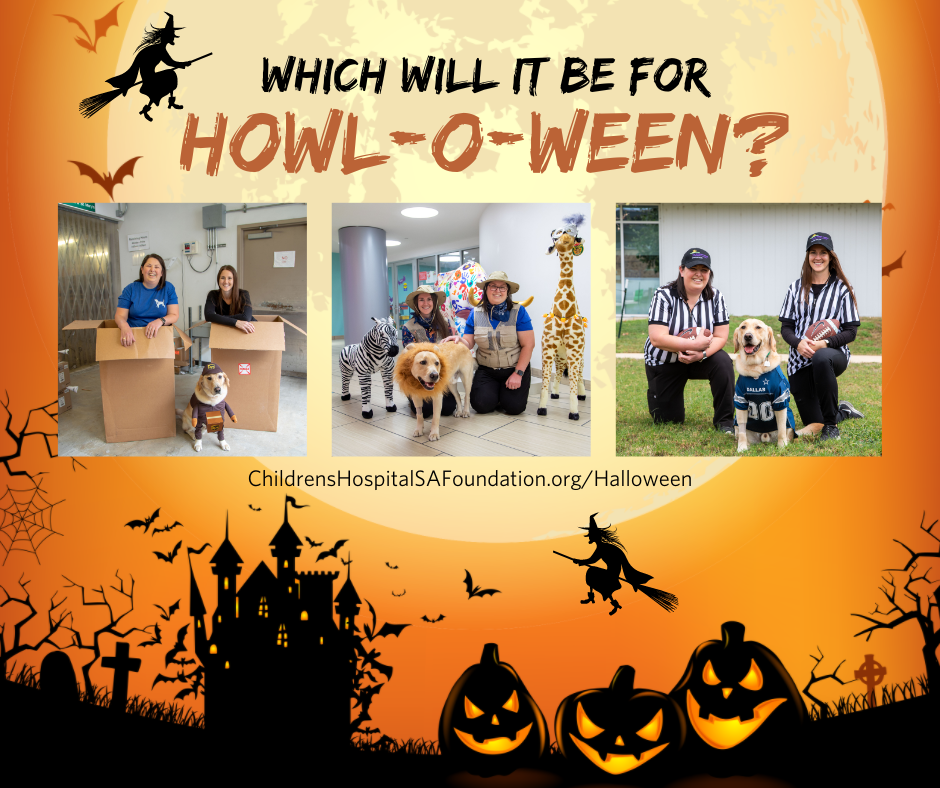 Spooky season is officially here and Marcus, our in-house facility pup, cannot wait to help us make the day paws-itively sweeter for patients spending Halloween at The Children’s Hospital of San Antonio. Every year, The Children’s Hospital hosts a trick-or-treat parade for our patients, and Marcus will play a big part in the celebrations, but he needs your help! What will Marcus be?